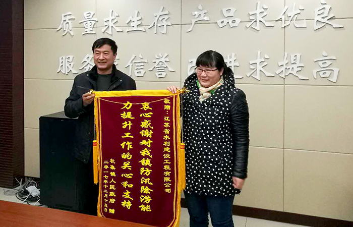 1215日,2017年广陵区农田水利重点县工程Ⅱ标通过了完工验收。验收会上,杭集水利站王站长代表杭集镇人民政府授予我单位锦旗,衷心感谢公司在农水重点县工程上作出的贡献,以及对杭集防汛除涝能力提升工作的关心与支持。