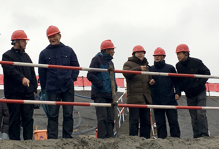 1月3日上午,省水利厅党组成员、副厅长、省水利工程建设局局长朱海生顶着风雨来到扬州市瓜洲泵站工程检查指导工作。扬州市水利局副局长、瓜洲泵站工程建设处主任凌国栋陪同检查,我公司项目经理郭中文汇报了现场施工情况。