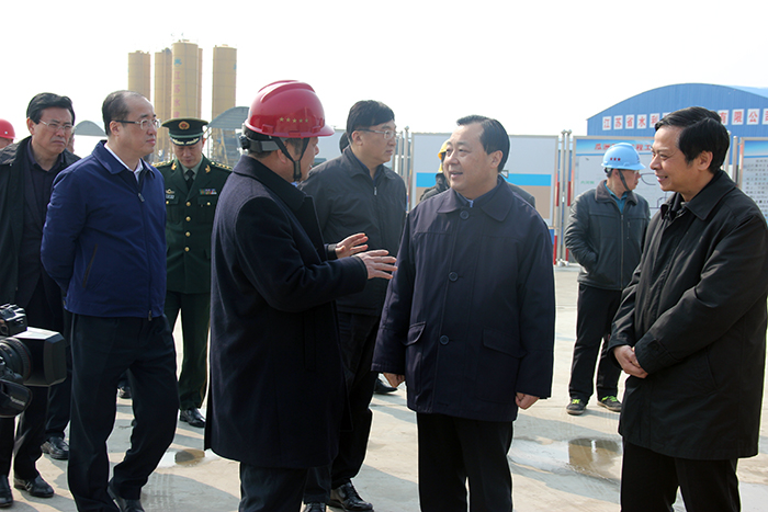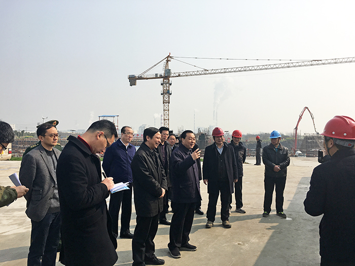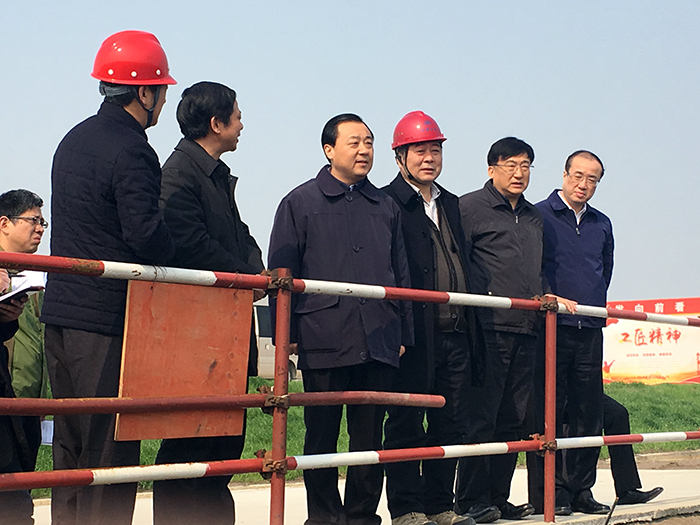 22日上午,早春的阳光和煦明媚,工地上处处生机盎然。谢正义一行来到泵站施工现场旁的大平台上,听取工程规划和建设情况介绍,了解工程施工组织情况,并仔细察看了施工现场。