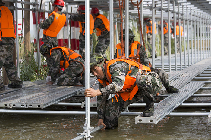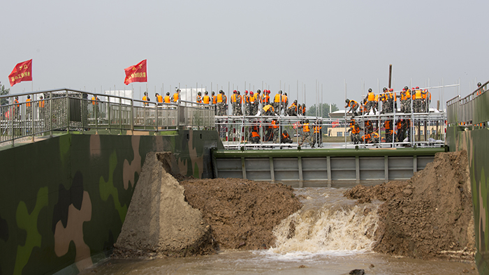 “是!江苏水建防汛抢险突击队立即开展钢木土石组合坝搭建作业!”