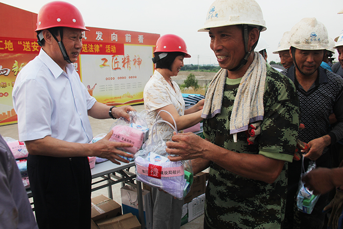汤超一行先后来到由我公司承建的新孟河界牌水利枢纽、扬州市瓜州泵站工程现场,看望和慰问坚守在工程一线的建设者,将防暑降温用品等送到一线职工手中,同时赠送了《安全生产法》《水利安全生产标准化指导手册》《建筑工人劳动防护手册》等安全生产法律法规和书籍。座谈过程中,汤超听取了工程建设管理情况的汇报,详细了解了一线职工的作息时间、工作强度、饮食卫生、住宿条件及现场防暑降温措施落实等情况,要求项目部合理安排职工作息时间,开展轮换作业,适当增加休息时间、减轻劳动强度,做好职工饮水、饮食卫生和防暑降温等工作。