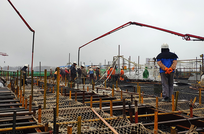 1月6日,2019年元旦假期刚结束没多久,气温仍然较低,寒意逼人,天还下着毛毛细雨,但界牌水利枢纽工程施工现场却是一派热火朝天的景象。上午8时许,界牌水利枢纽工程泵站第一联电机层混凝土开仓浇筑,经过28小时的连续奋战,于次日中午12时顺利完成了2250方的混凝土浇筑工作。
