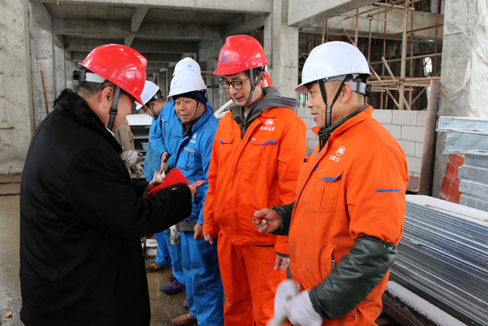 初四上午,公司董事长时爱祥带队来到工地现场,慰问坚守岗位的一线施工人员,给大家送来新年的祝福和关怀。
