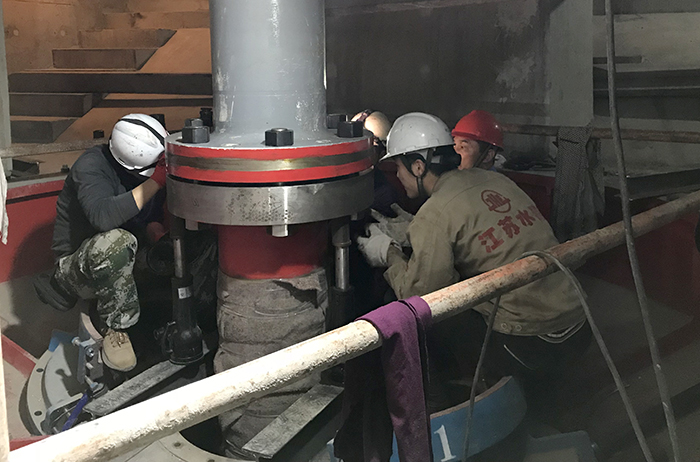 项目负责人陆建江介绍,在吊装进水伸缩节部件时,必须从专门的吊物孔吊装到泵站底部,然后再转运到各个泵机基井。该部件是水下最大的部件,重达5.5吨。由于负三层空间狭窄,吊车、行车等机械到不了位,转运难度可想而知,只能靠人工慢慢拖、慢慢滚,保证六台进水伸缩节全部就位。