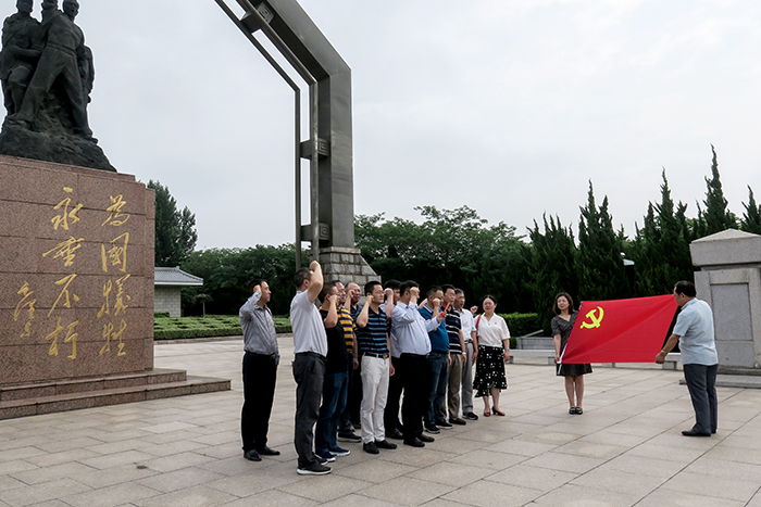 上午8点,公司领导班子成员、党委委员一行来到扬州革命烈士陵园,从入口牌楼拾阶而上,直达凭吊广场,由毛泽东同志题写的“为国牺牲永垂不朽”的纪念碑映入眼帘,时爱祥一行向革命烈士纪念碑三鞠躬,并带领大家重温了入党誓词,表达了“不忘初心、牢记使命”的庄严承诺。随后,时爱祥带领大家瞻仰了纪念碑北侧的烈士墓园,逐一向沿坡安放的嫣红色花岗岩烈士墓碑行注目礼,革命烈士为寻求救国救民,不惜以身赴死的英勇形象再次浮现眼前,更加坚定了大家把公司建设成江苏水利“治水铁军”的信念。
