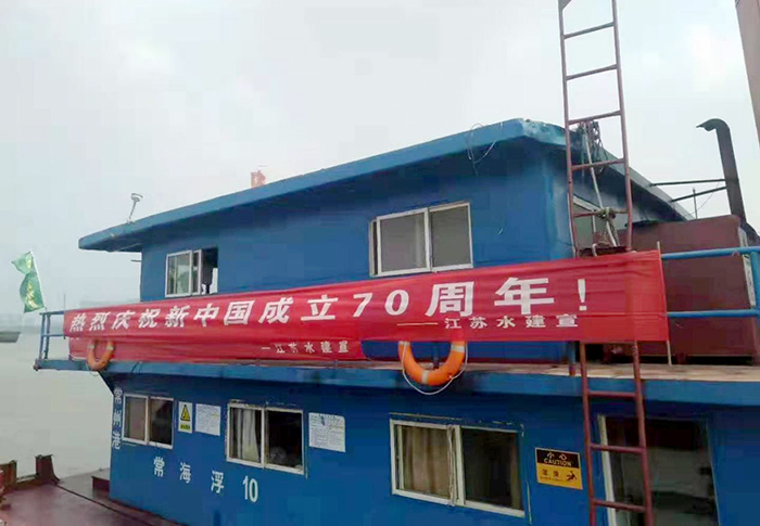 施工船上挂起建国70周年庆横幅