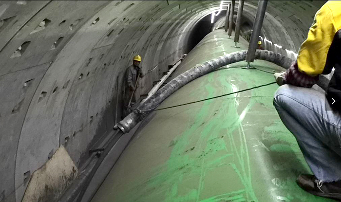 超远距离混凝土浇筑是本工程施工的又一难点。钢管进入隧道后,混凝土材料及浇筑设备无法进入隧道,无法用传统“接力泵送”的方式输送混凝土,前期准备的模板、钢筋、泵管等全部工作,只能通过隧道与钢管间不到一米的狭窄通道,通过人海战术手拎肩扛完成。隧道中间无任何缺口,无论从隧道哪一端的工作井浇筑,混凝土输送距离都接近1400米。项目部多方比选方案,最终采用了目前国内市场动力最大的柴油地泵。该地泵额定水平泵送距离800米,项目部从混凝土配比到泵管布设等各个环节精心组织,全面细化,完成了隧道中部1400米超远水平距离泵送混凝土浇筑,且一次成功,创下了公司超远距离混凝土浇筑的新记录,为公司今后类似工程积累了宝贵的施工经验。