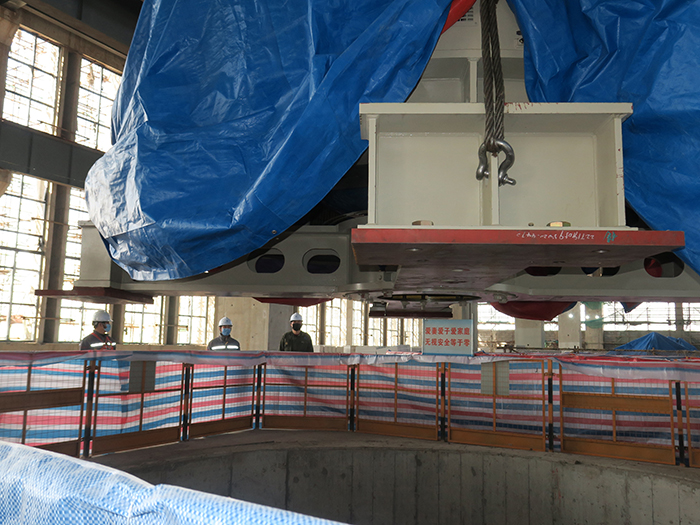 机安分公司安装队伍18人于19日全部抵达工地,立即投入开展水泵安装作业。图为他们正在进行6#电机定子吊装就位。