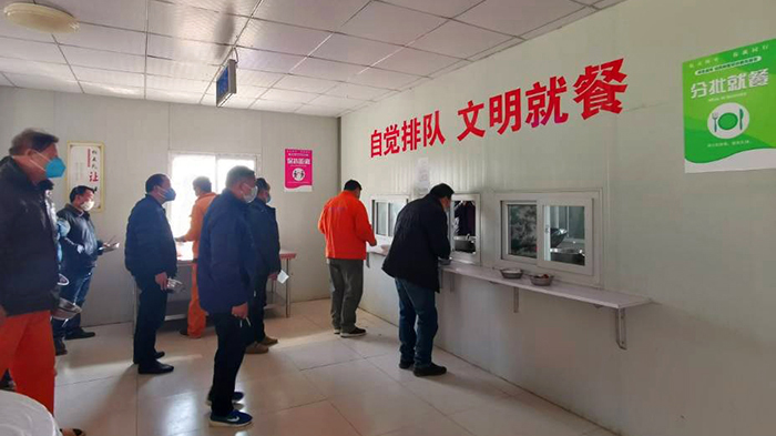 工人师傅们在食堂内排队打饭,分批单独就餐。
