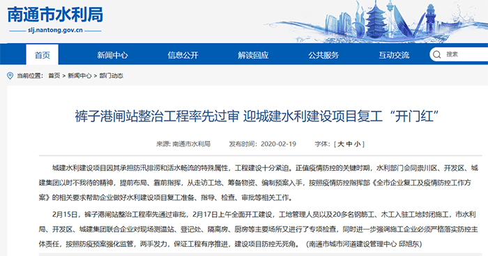 2月17日,由我公司一分公司承建的南通市裤子港闸站工程全面复工。项目部一手抓防控措施落实,一手抓安全复工筹备,工作得到南通市水利局、南通市经济开发区的肯定和表扬。
