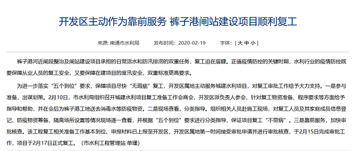为保障项目尽快“无瑕疵”复工,南通市水利局、开发区建设局对复工工作给予大力支持。一是参与准备,出谋划策。针对复工物资准备、程序要求等方面给予指导和帮助,为工地送来口罩、消毒水等防疫物资。二是现场查看,分类指导。相关领导赴施工现场,对复工人员及其家庭成员信息登记、防疫物资筹备、隔离场所设置等情况现场逐一查看,并根据“五个到位”要求进行分类指导,保证项目复工“不带病”。三是靠前服务,加快审批核查。本工程复工相关准备工作到位,申报材料上报至开发区后,开发区第一时间接受审批申请并进行审批核查,于2月15日完成审批工作,2月16日工人到工,2月17日正式复工。