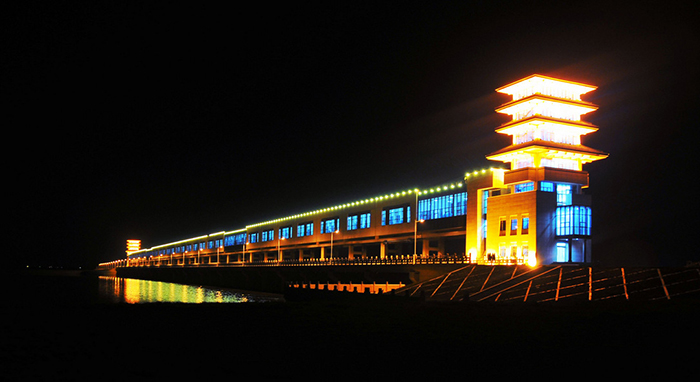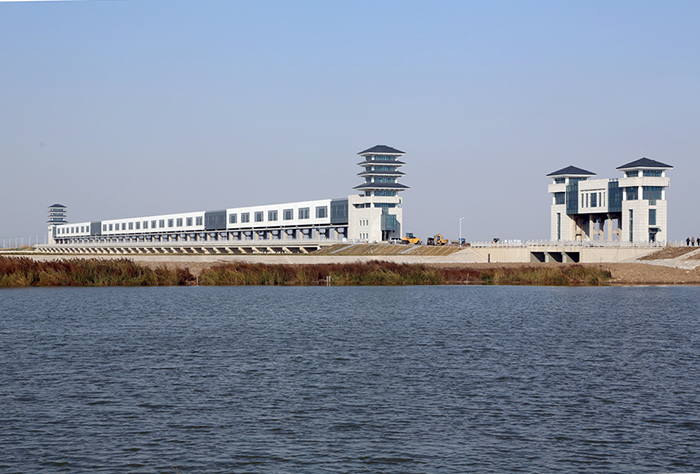 三洋港枢纽工程是新沭河治理工程的主要项目,既是淮河流域防洪保安的重要屏障、沂沭泗流域洪水东调入海的关键性工程,也是江苏沿海开发的重要支撑,被誉为江苏沿海“第一闸”。工程建设内容主要包括:三洋港挡潮闸、排水闸、排水通道土方开挖及护砌、管理处房屋、自动化控制及视频监控系统单位工程。三洋港挡潮闸按新沭河50年一遇洪水标准设计,设计流量6400立方米/秒,挡潮闸共33孔,总宽576.92米,是江苏省沿海最大的挡潮闸,其主要功能是:挡潮防淤,保护河道治理成果,保持河道行洪能力;改善排涝条件;利用河槽蓄水,为连云港市增加水源;改善交通条件,促进港口发展。