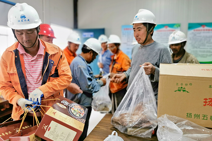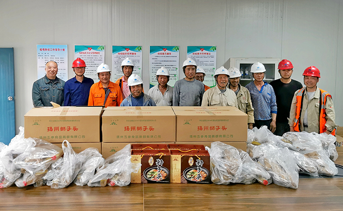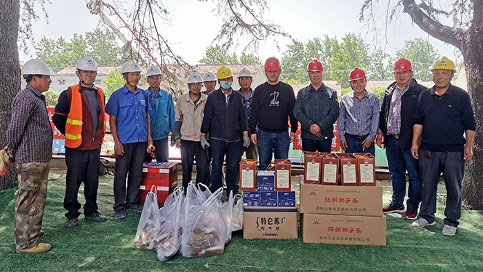 从年后复工至今,公司多个项目一直处于紧张忙碌的抢工之中,向着“530”重大节点目标迈进。为鼓舞士气,加强项目建设过程中的安全监督工作,公司工会在“五一”前后深入项目一线指导工作、慰问员工。公司党委副书记、副总经理、工会主席姜启生带队,分别来到定波水利枢纽工程,以及新孟河流域的界牌枢纽工程、常州新北区河道施工III标、北干河施工II标,宿迁船行灌区施工3标等项目,为复工以来一直坚守工作岗位的项目管理人员、工友们送去亲切的关怀和诚挚的慰问,牛奶、八宝粥、狮子头、盐水鹅等富有扬州特色的慰问品,让他们在奋力抢工之余能够品尝到“家”的味道、感受到“家”的温暖。