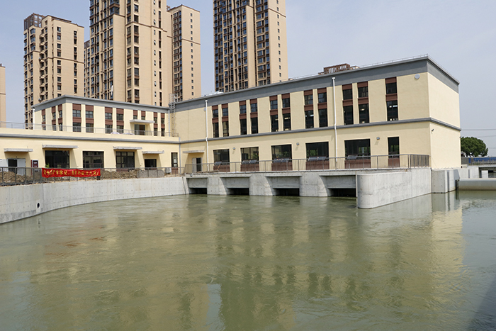 陆泾河泵闸包括新建陆泾河泵闸一座,设计引水流量为15m3/s(单向泵站),校核引水流量20m3/s,安装4台平面‘S’型轴伸泵,单台设计流量为5m3/s;泵闸配套钢坝一座,单孔净宽为8米。泵站布置在陆泾河西岸,为单向泵站,功能为从阳澄湖向金鸡湖引水;节制闸布置在陆泾河东岸,功能为泵站引水时的水位控制。